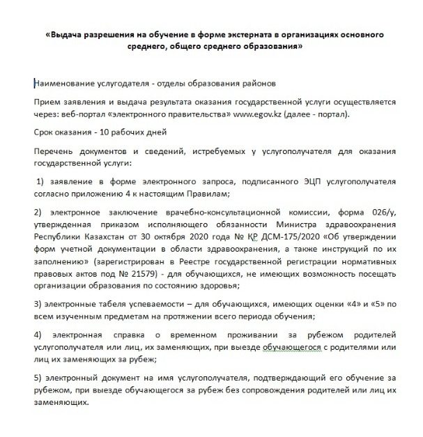 «Выдача разрешения на обучение в форме экстерната в организациях основного среднего, общего среднего образования»