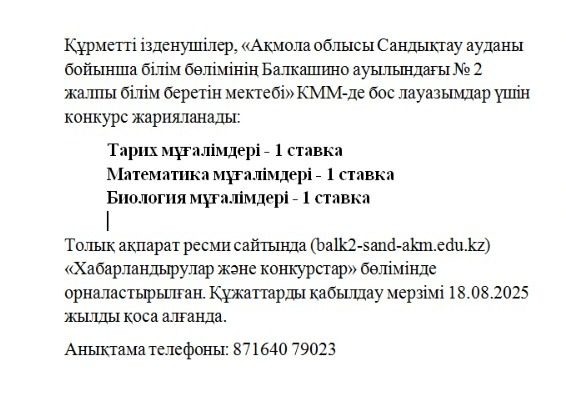 «Ақмола   облысы   білім       басқармасының Сандықтау  ауданы  бойынша  білім  бөлімі  Балкашин  аулының  №2 жалпы орта білім беретін мектебі» коммуналдық мемлекеттік мекемесіне