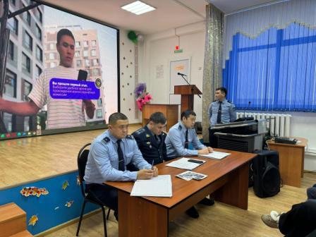 Бүгін КММ «№1 жалпы білім беретін мектепте» 9 және 11 сынып оқушыларымен Қазақстан Республикасы ІІМ академияларына түсу мүмкіндіктері туралы әңгіме жүргізілді. Оқушылар талапкерлерге қойылатын талаптар, оқу үдерісінің ерекшеліктері, болашақ қызметтің перспективалары және ішкі істер органдарының болашақ қызметкері иеленуі тиіс жеке қасиеттердің маңыздылығы туралы мәлімет алды.